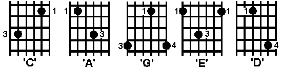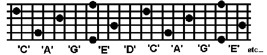 By laying these five patterns out so that they overlap each other in the order that spells the word 'CAGED' we are able to chart every occurrence of any given note on the fretboard: